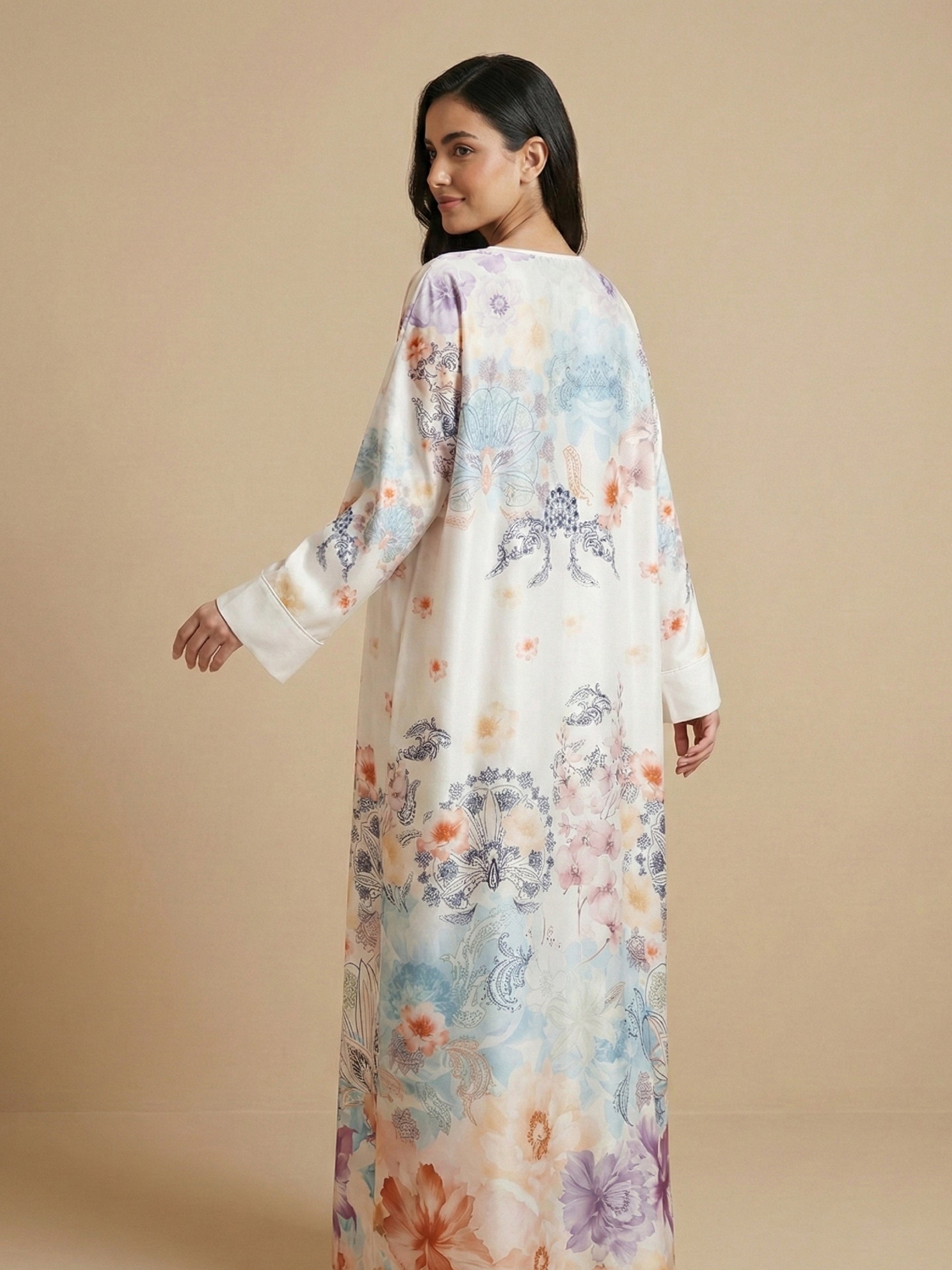 جلابية بطبعات باستيل هادئة وانسيابية ناعمة، تمنحك إطلالة أنثوية خفيفة تجمع بين الراحة والأناقة للاستخدام اليومي