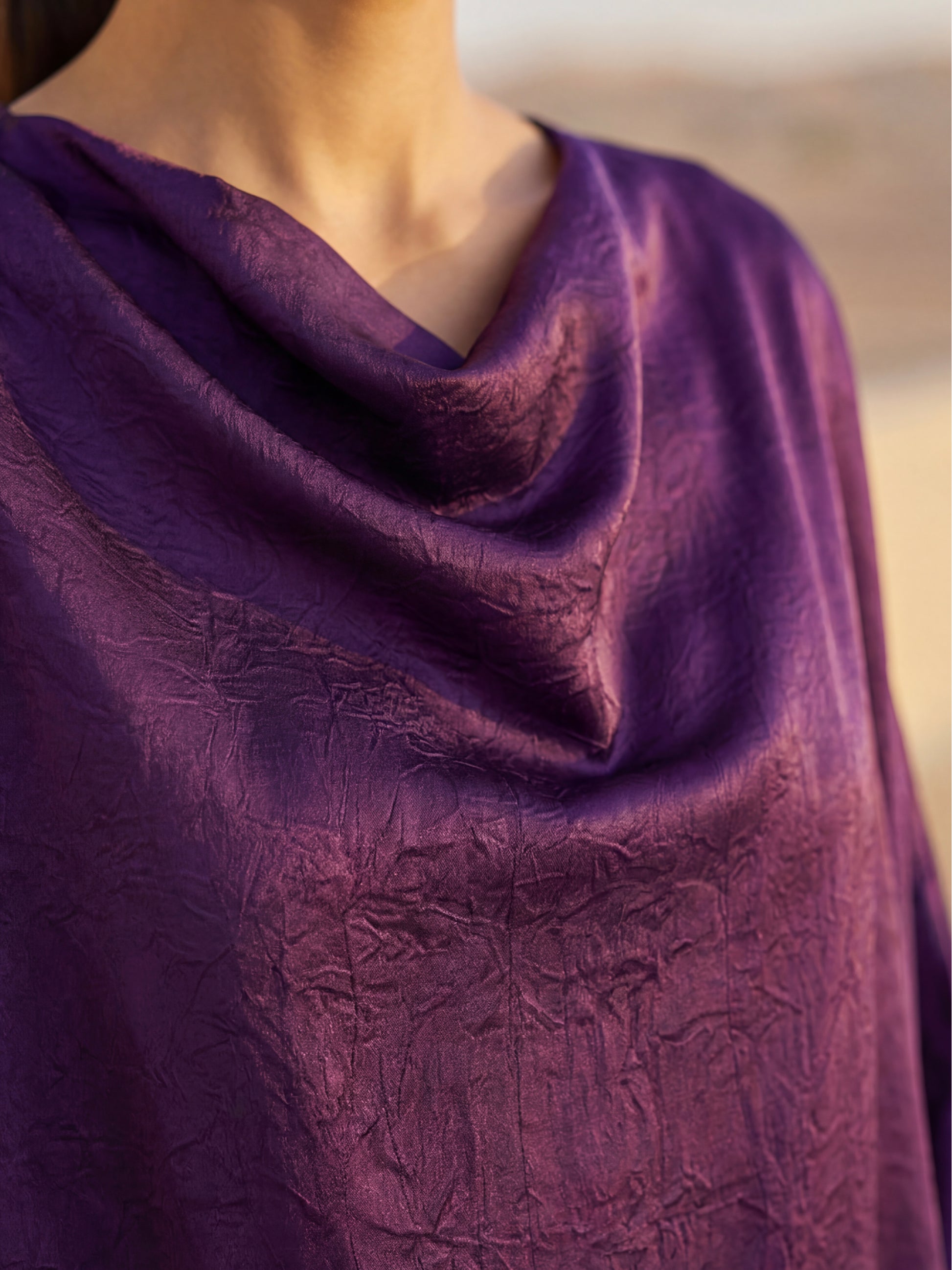 جلابية أنيقة باللون البنفسجي الملكي بتصميم انسيابي واسع يمنح إطلالة راقية وعصرية. يتميز القماش بملمس ناعم ولمعة خفيفة تضيف لمسة فخامة للتصميم