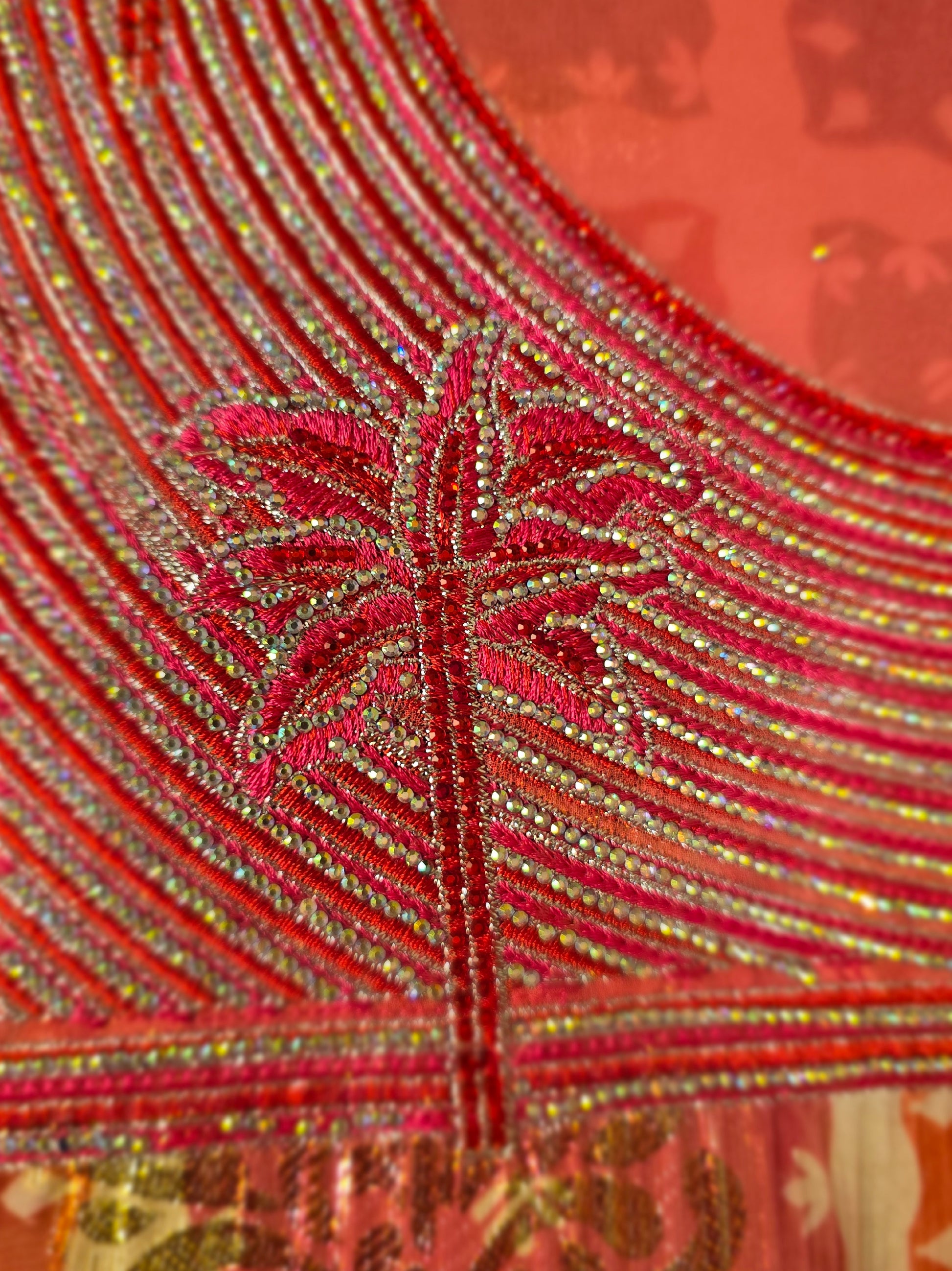 قماش مخاوير غير مخيط من خامة الشيفون الخفيفة يتميز بدرجات اللون الوردي مع نقوش ولمسات ذهبية تضيف بريقاً أنيقاً للتصميم. تأتي الياقة بتطريز مميز باللون الوردي مع تفاصيل دقيقة تمنح القطعة مظهراً فاخراً وجذاباً. يتميز القماش بخفة وانسيابية رائعة عند الخياطة، مما يجعله مثالياً لتفصيل الجلابيات أو المخاوير بتصاميم أنيقة وأنثوية.